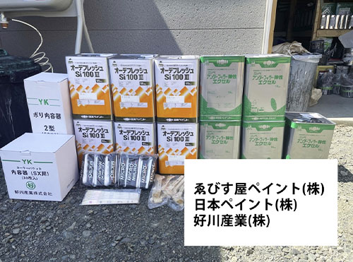 次に材料を準備していきます。使用する塗料・用具は、ゑびす屋ペイント(株)様、日本ペイント(株)様、好川産業(株)様の製品です。いつも協賛いただきありがとうござます。