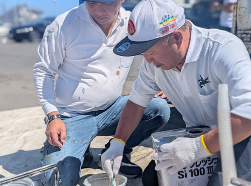 塗料を準備しています。塗料の希釈や撹拌を正しく行うことで、塗料本来の性能を発揮できます。